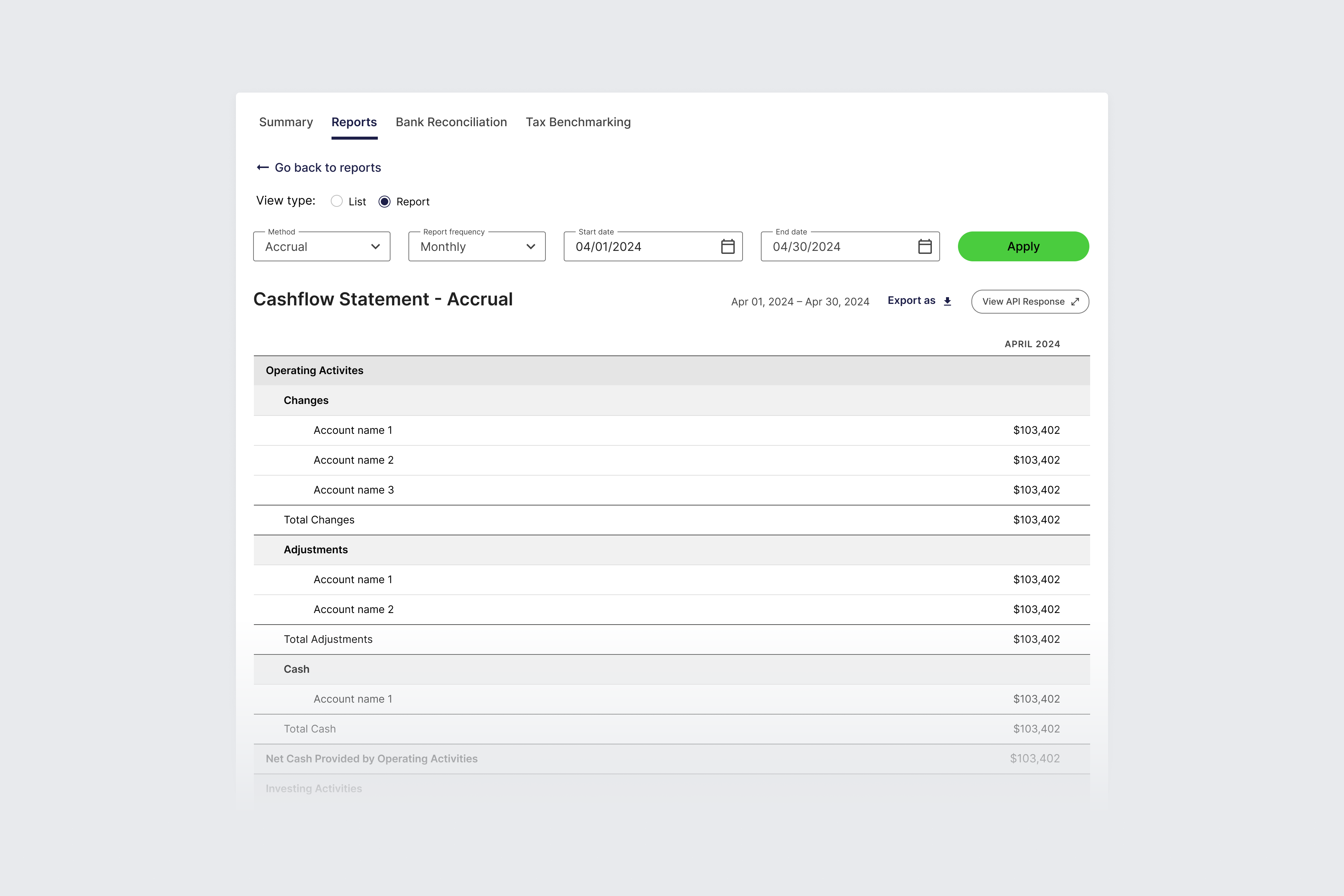 We are excited to introduce the Cashflow Statement Report in a new traditional accounting format view that provides insights into how cash moves in and out of a business over a specific period. It is seamlessly integrated into the Accounting Data as a Service™ Dashboard and users of the Cashflow Statement Report will have the option to view this data in List or Report view.