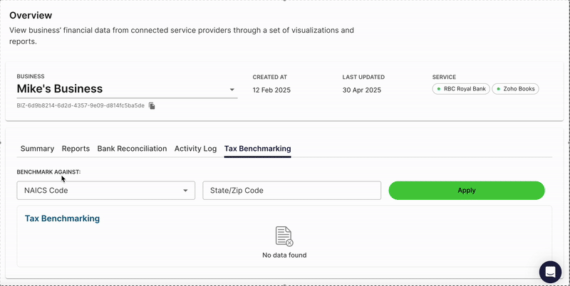 The Tax Benchmarking Report, provides a way for a selected business to compare how they are performing against other businesses. The Data retrieved will reflect the latest full calendar year.