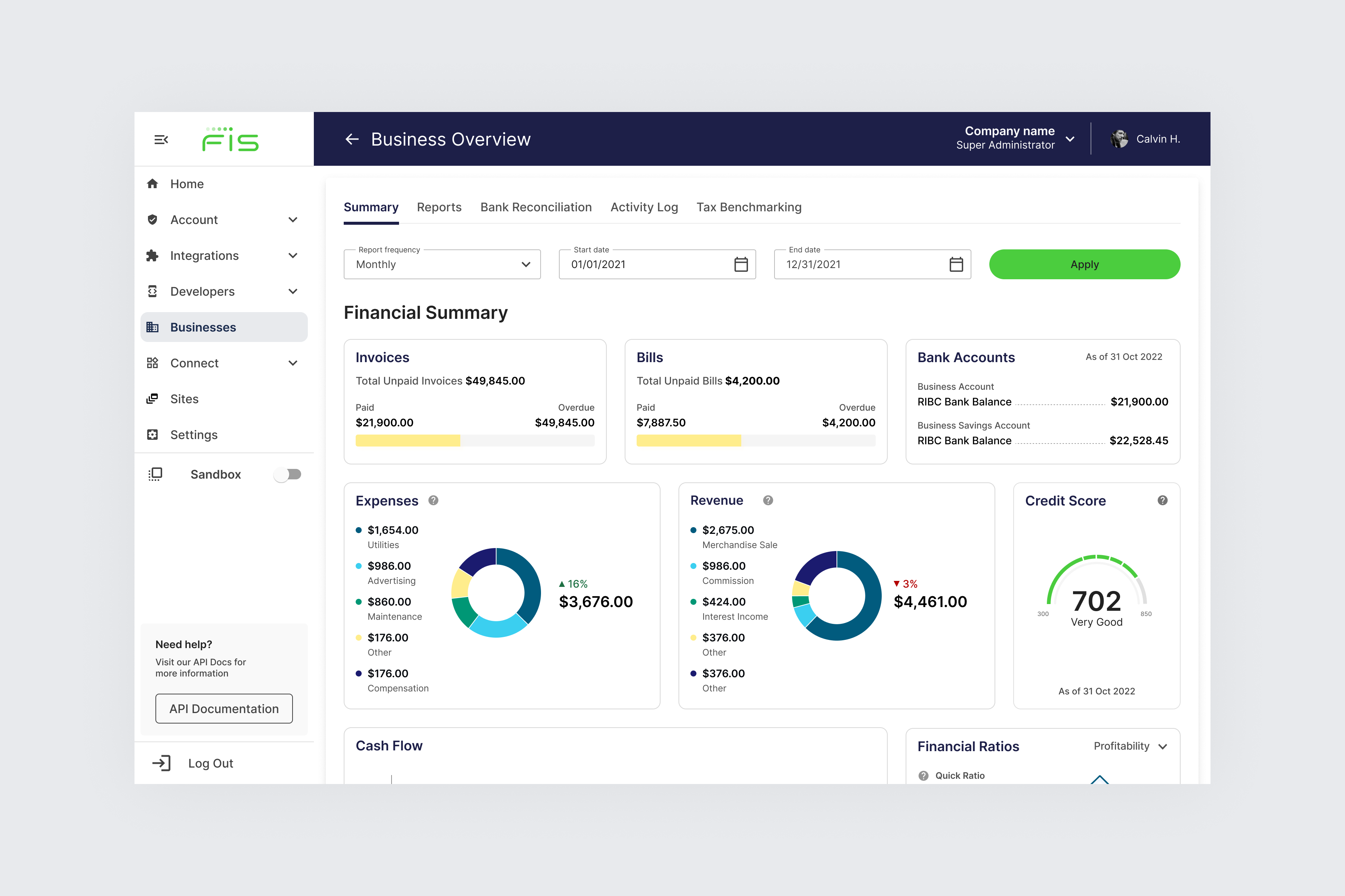 - A brief Summary of a business's financial summary including top revenue & expenses, outstanding bills & invoice amounts, financial statements, as well as financial ratios, bank balance and credit score & rating.