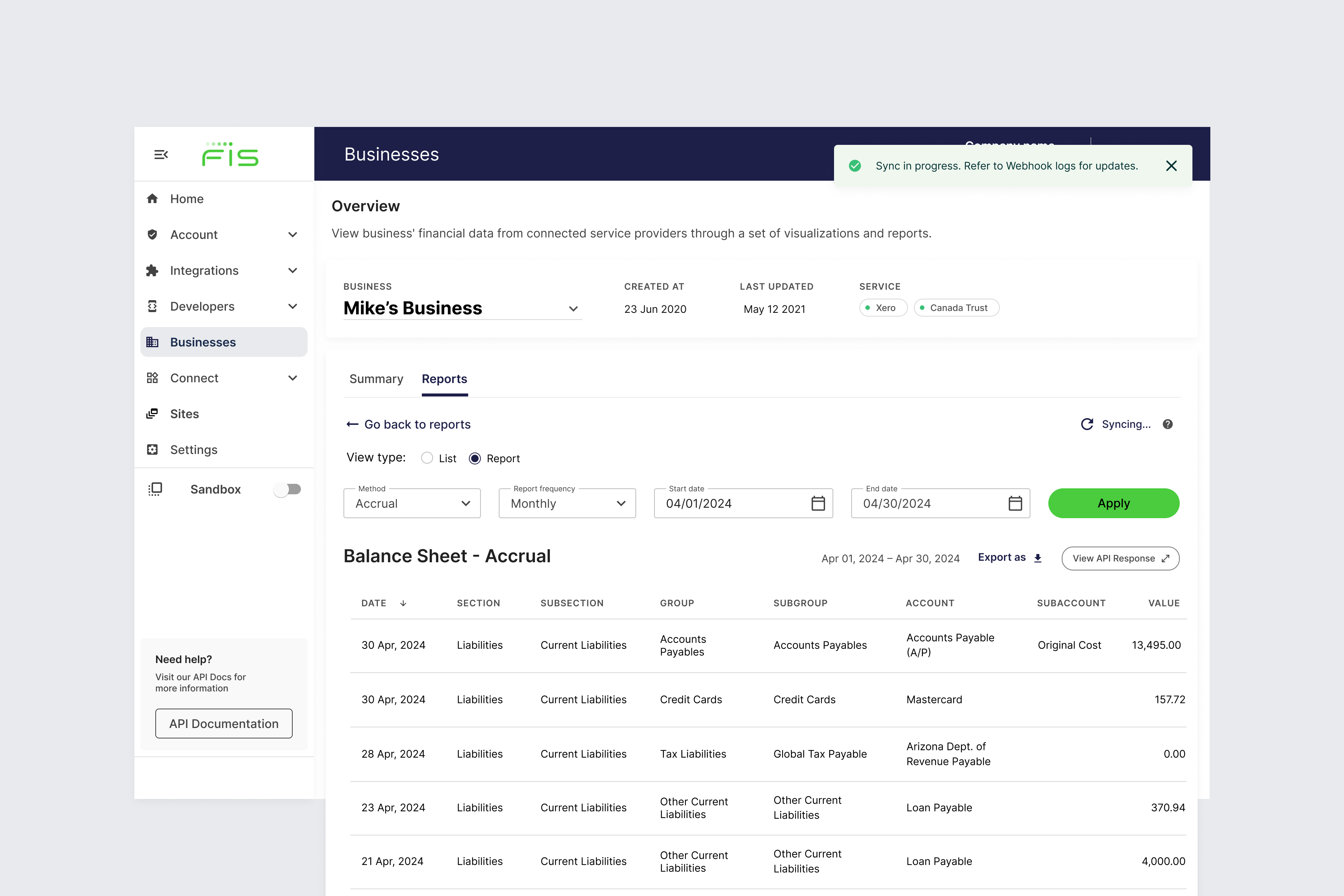 The Accounting Data as a Service™ Dashboard reports page provides you access to view and download data for your businesses. Reports are valuable resources that provide insights into various aspects of our API, and can aid in decision-making and analysis about your businesses.
